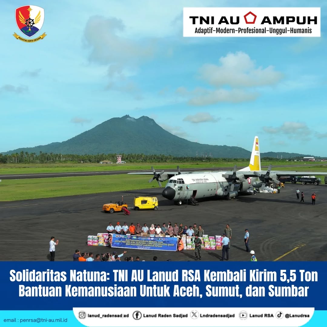 Pangkalan TNI AU Raden Sadjad (Lanud RSA) kembali menyalurkan bantuan dari masyarakat Natuna untuk korban bencana di Aceh, Sumatera Utara, dan Sumatera Barat. Bantuan diberangkatkan menggunakan pesawat Hercules TNI AU A-1318 dari Skadron Udara 31 melalui Lanud RSA, Kabupaten Natuna, Provinsi Kepulauan Riau, Kamis (11/12/2025).