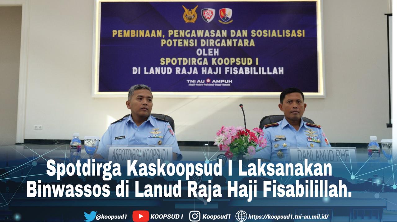 Dalam rangka meningkatkan tugas dan fungsi Staf Potensi Dirgantara (Spotdirga), Aspotdirga Kaskoopsud I Kolonel Nav Anton Bimo Risandi melaksanakan pembinaan, pengawasan dan sosialisasi (Binwassos) yang dilaksanakan di Gedung Dirgantara, Mako Lanud Raja Haji Fisabilillah. (Kamis, 30-5-2024).