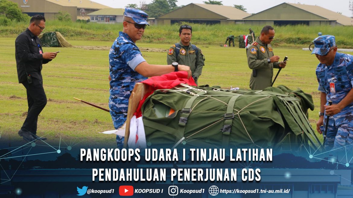 Subang, Penkoopsud I. Pangkoops Udara I Marsda TNI Mohammad Nurdin dampingi Pangkoopsudnas Marsdya TNI Ir. Tedi Rizalihadi S., M.M., dalam meninjau Latihan Pendahuluan Penerjunan CDS (Cargo Delivery System)/DZ (Dropping Zone) di Lanud Suryadarma, Kalijati, Subang, Jawa Barat. (Senin, 18-3-2024).