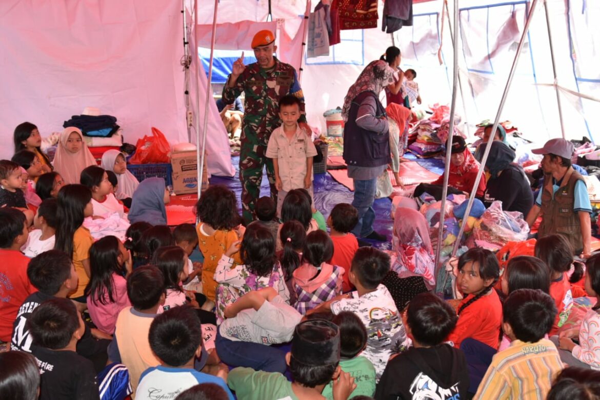 Lanud Ats. Ditengah musibah kejadian Gempa Cianjur, Tim Satuan Tugas Dukungan (Satgasduk) Murai Sakti II dari Lanud Ats bekerjasama dengan Forum Komunikasi Tenaga Kesejahteraan Sosial Kabupaten Bogor, hari ini, Kamis (1/12/2022) berikan Layanan Dasar Psikologi/Trauma Healing kepada korban Gempa Cianjur