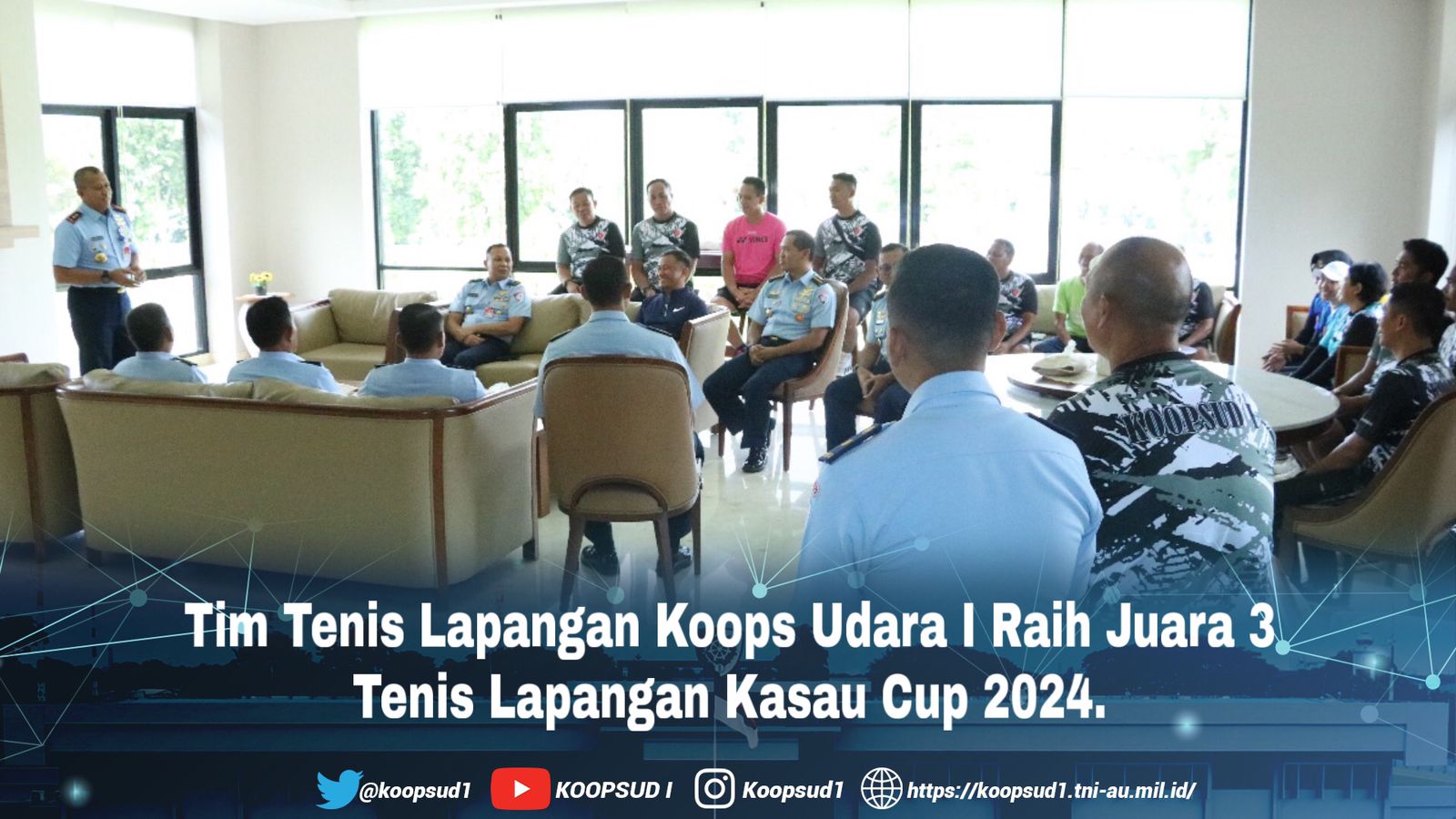 Jakarta, Penkoopsud I. Panglima Komando Operasi Udara I Marsda TNI Mohammad Nurdin menerima kedatangan kontingen Tim Tenis Lapangan Koops Udara I setelah usai meraih Juara 3 di Turnamen Tenis Lapangan Kasau Cup 2024, bertempat di Ruang Arjuna Makoops Udara I. (Kamis, 22-2-2024).