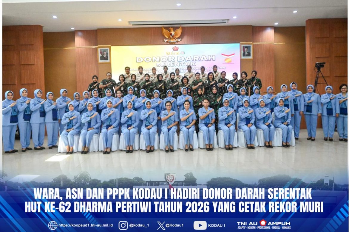 Jakarta, Penkodau I. Wara, ASN dan PPPK Wanita Kodau I turut serta sumbangkan darah dalam kegiatan donor darah serentak dalam rangka Apel Bersama Wanita TNI dan HUT ke-62 Dharma Pertiwi Tahun 2026. Untuk Kodau I yang tergabung bersama jajaran TNI Angkatan Udara wilayah Jakarta lainnya, bertempat di Gedung Roesmin Nurjadin, Makodau I. Giat donor darah serentak TNI tersebut secara terpusat digelar di GOR Ahmad Yani, Mabes TNI. (Kamis, 2-4-2026).
